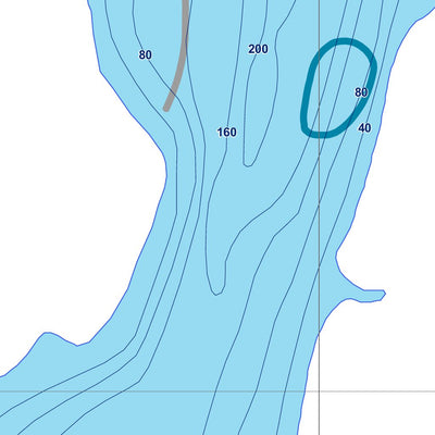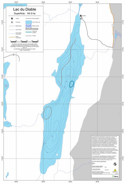 Carte de lac de la Sépaq. Selon les données disponibles, la carte peut présenter diverses informations telles que la bathymétrie ou les sites favorables à la pêche.