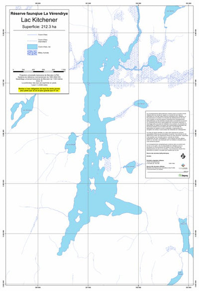 Carte de lac de la Sépaq. Selon les données disponibles, la carte peut présenter diverses informations telles que la bathymétrie ou les sites favorables à la pêche.