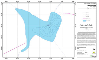 Carte de lac de la Sépaq. Selon les données disponibles, la carte peut présenter diverses informations telles que la bathymétrie ou les sites favorables à la pêche.
