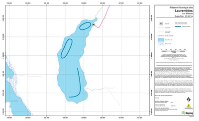 Carte de lac de la Sépaq. Selon les données disponibles, la carte peut présenter diverses informations telles que la bathymétrie ou les sites favorables à la pêche.
