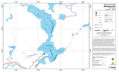 Carte de lac de la Sépaq. Selon les données disponibles, la carte peut présenter diverses informations telles que la bathymétrie ou les sites favorables à la pêche.