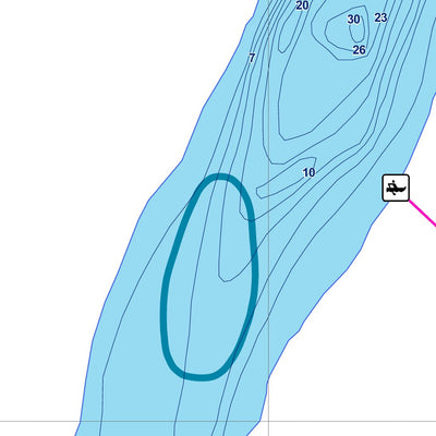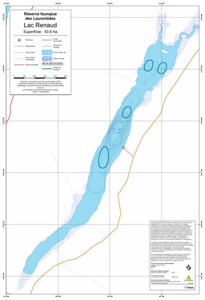 Carte de lac de la Sépaq. Selon les données disponibles, la carte peut présenter diverses informations telles que la bathymétrie ou les sites favorables à la pêche.