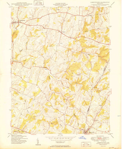 A 1950 historical topographic map of Libertytown in Maryland produced by the United States Geological Survey (USGS). It shows contour lines, place names, water bodies and roads. Map services and data available from U.S. Geological Survey, National Geospatial Program. Map was obtained from https:/...