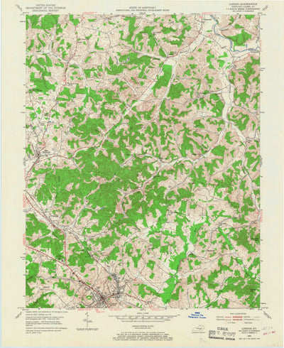 A 1952 historical topographic map of London in Kentucky produced by the United States Geological Survey (USGS). It shows contour lines, place names, water bodies and roads. Map services and data available from U.S. Geological Survey, National Geospatial Program. Map was obtained from https://www....
