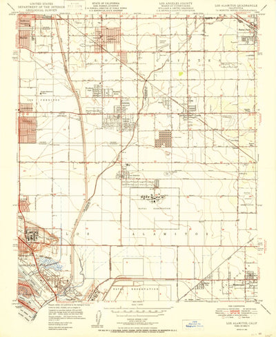 A 1950 historical topographic map of Los Alamitos in California produced by the United States Geological Survey (USGS). It shows contour lines, place names, water bodies and roads. Map services and data available from U.S. Geological Survey, National Geospatial Program. Map was obtained from http...