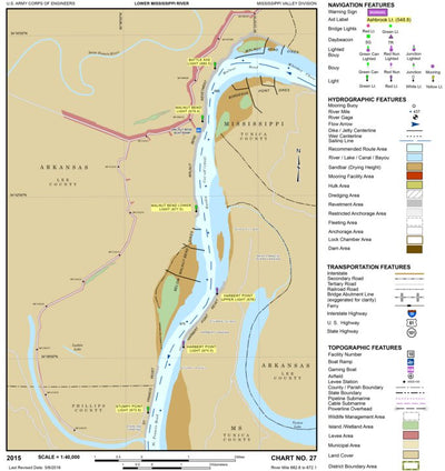 The maps presented here were developed with data provided by the U.S. Army Corps of Engineers. The 2015 Navigation Chart has been designed to promote safe navigation for both deep-draft and shallow-draft vessels up and down the Lower Mississippi River, Gulf of Mexico to Ciaro, IL.