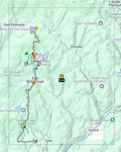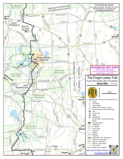 Map "M24 - Bowman Lake S.P." shows the FLT Main trail in Chenango County from Fred Stewart Rd at Hoag-Childes Rd to Stone Quarry Hill Rd.