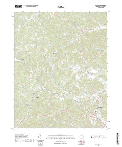 A digital topographic map of Manchester in Kentucky produced by the United States Geological Survey (USGS) in 2022. The map is part of the National Map series of 7.5 minute quadrangle maps. It shows contour lines, place names, water bodies and roads. Map services and data available from U.S. Geol...