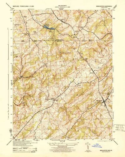 A 1944 historical topographic map of Manchester in Maryland produced by the United States Geological Survey (USGS). It shows contour lines, place names, water bodies and roads. Map services and data available from U.S. Geological Survey, National Geospatial Program. Map was obtained from https://...