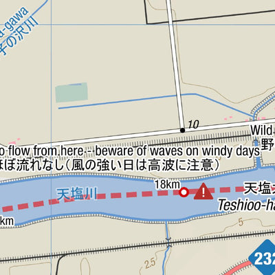 Topographical river map for the canoe tripping route from Shibetsu City to Teshio Town in northern Hokkaido, Japan.