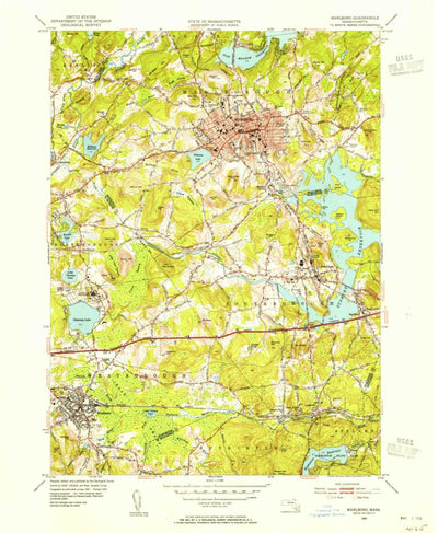 A 1953 historical topographic map of Marlborough in Massachusetts produced by the United States Geological Survey (USGS). It shows contour lines, place names, water bodies and roads. Map services and data available from U.S. Geological Survey, National Geospatial Program. Map was obtained from ht...