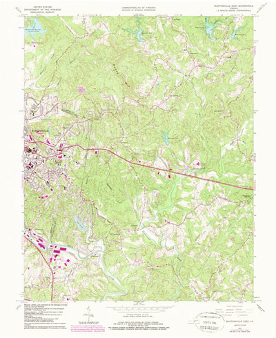 A 1964 historical topographic map of Martinsville East in Virginia produced by the United States Geological Survey (USGS). It shows contour lines, place names, water bodies and roads. Map services and data available from U.S. Geological Survey, National Geospatial Program. Map was obtained from h...
