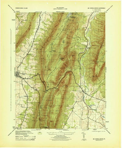 A 1944 historical topographic map of Mcconnellsburg in Pennsylvania produced by the United States Geological Survey (USGS). It shows contour lines, place names, water bodies and roads. Map services and data available from U.S. Geological Survey, National Geospatial Program. Map was obtained from ...