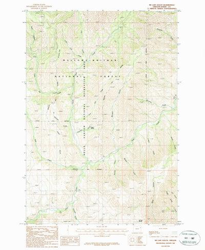 A 1987 historical topographic map of Mclain Gulch in Oregon produced by the United States Geological Survey (USGS). It shows contour lines, place names, water bodies and roads. Map services and data available from U.S. Geological Survey, National Geospatial Program. Map was obtained from https://...
