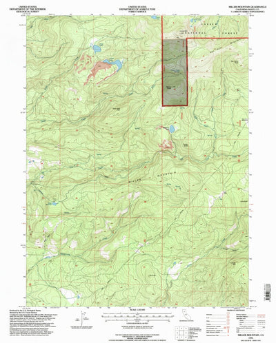 A 1995 historical topographic map of Miller Mountain in California produced by the United States Geological Survey (USGS). It shows contour lines, place names, water bodies and roads. Map services and data available from U.S. Geological Survey, National Geospatial Program. Map was obtained from h...