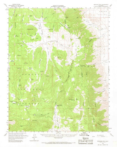 A 1956 historical topographic map of Monache Mountain in California produced by the United States Geological Survey (USGS). It shows contour lines, place names, water bodies and roads. Map services and data available from U.S. Geological Survey, National Geospatial Program. Map was obtained from ...