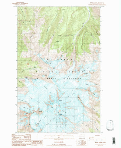 A 1989 historical topographic map of Mount Baker in Washington produced by the United States Geological Survey (USGS). It shows contour lines, place names, water bodies and roads. Map services and data available from U.S. Geological Survey, National Geospatial Program. Map was obtained from https...