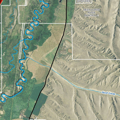 Hunting and recreation map displaying aerial imagery overlaid with public lands, roads, trails, streams, recreation sites, and other points or areas of interest. Public land is color coded and private parcel boundaries larger than 2.5 acres are shown. Larger parcels over 20 acres are labeled with...