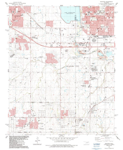 A 1986 historical topographic map of Mustang in Oklahoma produced by the United States Geological Survey (USGS). It shows contour lines, place names, water bodies and roads. Map services and data available from U.S. Geological Survey, National Geospatial Program. Map was obtained from https://www...