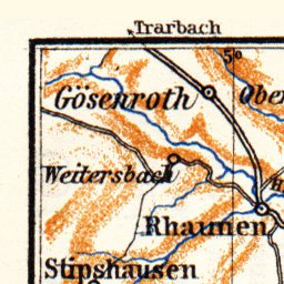 Old vintage map of the vicinities of Nahe Valley and Kreuznach from 1905, in Germany, then in the German Empire, by Wagner & Debes, at the scale of 1:300,000. Digitally restored. A part of the Discus Media 1900 Collection.