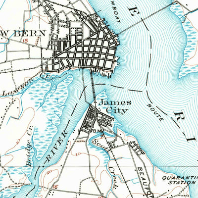 A 1901 historical topographic map of New Bern in North Carolina produced by the United States Geological Survey (USGS). It shows contour lines, place names, water bodies and roads. Map services and data available from U.S. Geological Survey, National Geospatial Program. Map was obtained from http...
