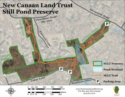 Trail map for the New Canaan Land Trust's Still Pond Preserve. This map includes the Silvermine-Fowler Preserve, Hicks Meadow, and Henry Kelley Uplands. For more information about this property, including rules, parking locations, history, and current projects, please visit www.NewCanaanLandTrust...