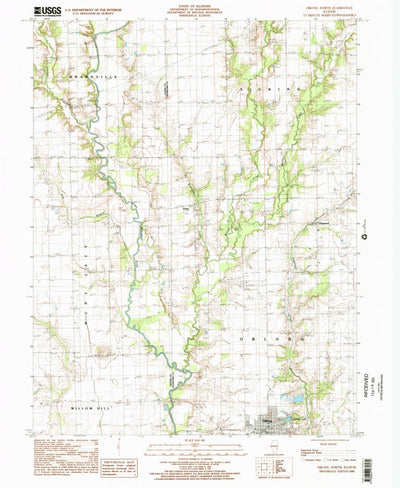A 1998 historical topographic map of Oblong North in Illinois produced by the United States Geological Survey (USGS). It shows contour lines, place names, water bodies and roads. Map services and data available from U.S. Geological Survey, National Geospatial Program. Map was obtained from https:...