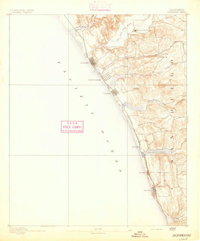 A 1893 historical topographic map of Ocean Side in California produced by the United States Geological Survey (USGS). It shows contour lines, place names, water bodies and roads. Map services and data available from U.S. Geological Survey, National Geospatial Program. Map was obtained from https:...
