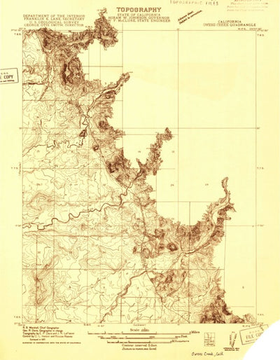 A 1915 historical topographic map of Owens Reservoir in California produced by the United States Geological Survey (USGS). It shows contour lines, place names, water bodies and roads. Map services and data available from U.S. Geological Survey, National Geospatial Program. Map was obtained from h...