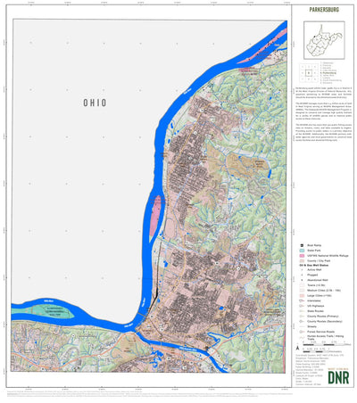This map was produced using USGS 7.5-minute quadrangles. The maps shows locations of public lands including, but not limited to national forests, state forests, wildlife management areas, and county/city parks in the Parkersburg quadrangle. The map also shows West Virginia Division of Natural Res...