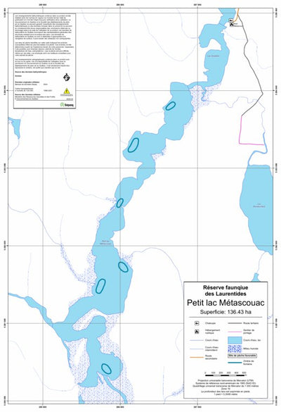 Carte de lac de la Sépaq. Selon les données disponibles, la carte peut présenter diverses informations telles que la bathymétrie ou les sites favorables à la pêche.