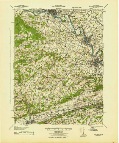 A 1943 historical topographic map of Phoenixville in Pennsylvania produced by the United States Geological Survey (USGS). It shows contour lines, place names, water bodies and roads. Map services and data available from U.S. Geological Survey, National Geospatial Program. Map was obtained from ht...
