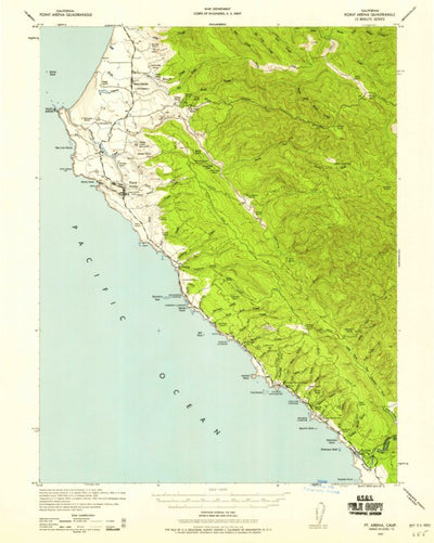 A 1943 historical topographic map of Point Arena in California produced by the United States Geological Survey (USGS). It shows contour lines, place names, water bodies and roads. Map services and data available from U.S. Geological Survey, National Geospatial Program. Map was obtained from https...