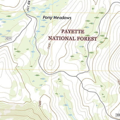 A digital topographic map of Pony Meadows in Idaho produced by the United States Geological Survey (USGS) in 2020. The map is part of the National Map series of 7.5 minute quadrangle maps. It shows contour lines, place names, water bodies and roads. Map services and data available from U.S. Geolo...