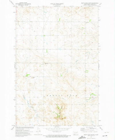 A 1972 historical topographic map of Pretty Rock Butte in North Dakota produced by the United States Geological Survey (USGS). It shows contour lines, place names, water bodies and roads. Map services and data available from U.S. Geological Survey, National Geospatial Program. Map was obtained fr...