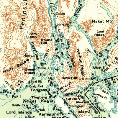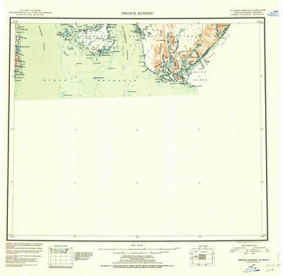 A 1951 historical topographic map of Prince Rupert in Alaska produced by the United States Geological Survey (USGS). It shows contour lines, place names, water bodies and roads. Map services and data available from U.S. Geological Survey, National Geospatial Program. Map was obtained from https:/...