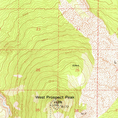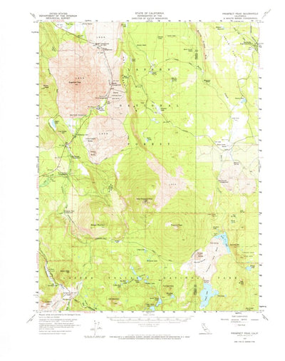 A 1957 historical topographic map of Prospect Peak in California produced by the United States Geological Survey (USGS). It shows contour lines, place names, water bodies and roads. Map services and data available from U.S. Geological Survey, National Geospatial Program. Map was obtained from htt...
