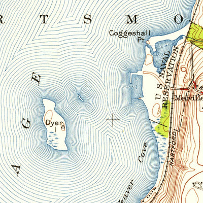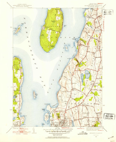 A 1939 historical topographic map of Prudence Island in Rhode Island produced by the United States Geological Survey (USGS). It shows contour lines, place names, water bodies and roads. Map services and data available from U.S. Geological Survey, National Geospatial Program. Map was obtained from...