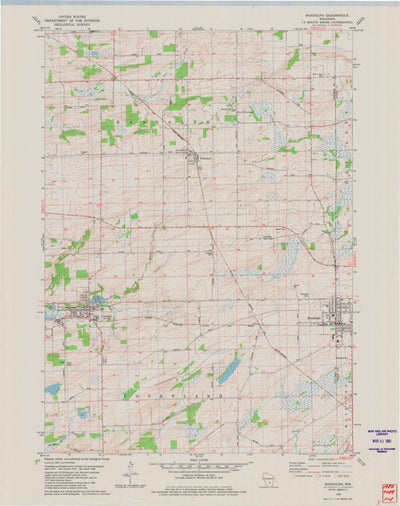 A 1980 historical topographic map of Randolph in Wisconsin produced by the United States Geological Survey (USGS). It shows contour lines, place names, water bodies and roads. Map services and data available from U.S. Geological Survey, National Geospatial Program. Map was obtained from https://w...
