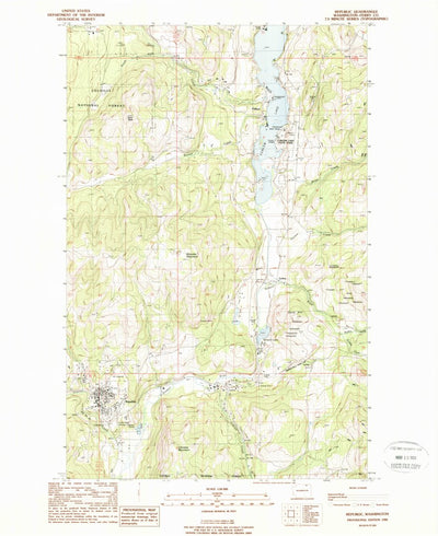A 1988 historical topographic map of Republic in Washington produced by the United States Geological Survey (USGS). It shows contour lines, place names, water bodies and roads. Map services and data available from U.S. Geological Survey, National Geospatial Program. Map was obtained from https://...