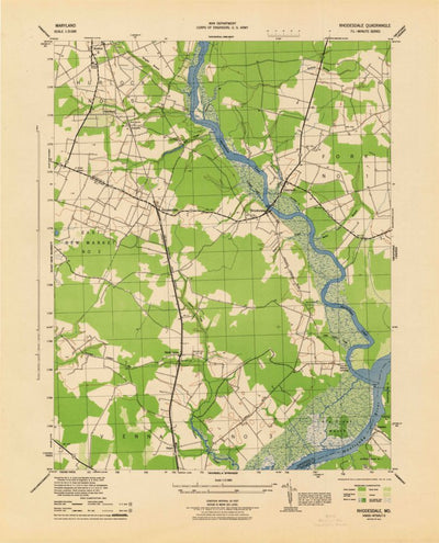 A 1944 historical topographic map of Rhodesdale in Maryland produced by the United States Geological Survey (USGS). It shows contour lines, place names, water bodies and roads. Map services and data available from U.S. Geological Survey, National Geospatial Program. Map was obtained from https://...