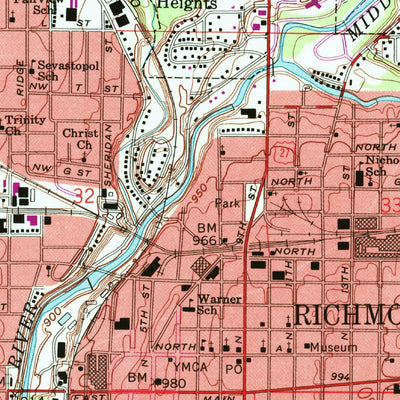 A 1960 historical topographic map of Richmond in Indiana produced by the United States Geological Survey (USGS). It shows contour lines, place names, water bodies and roads. Map services and data available from U.S. Geological Survey, National Geospatial Program. Map was obtained from https://www...