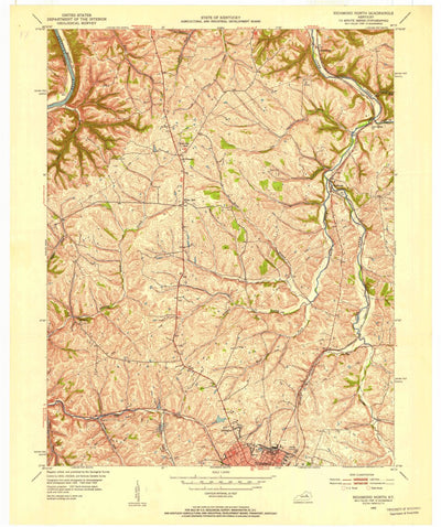 A 1952 historical topographic map of Richmond North in Kentucky produced by the United States Geological Survey (USGS). It shows contour lines, place names, water bodies and roads. Map services and data available from U.S. Geological Survey, National Geospatial Program. Map was obtained from http...