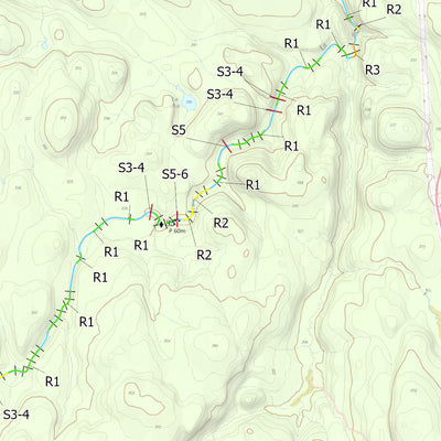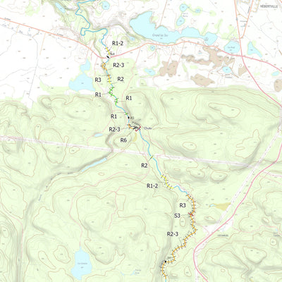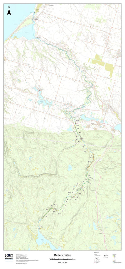 Carte couvrant le trajet de la rivière La Belle Rivière indiquant les mises à l'eau, les rapides, portages, sites de camping et autres sites d'intérêt dans les abords immédiat de la rivière.