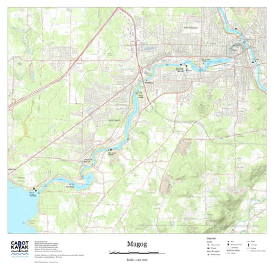 Carte couvrant le trajet de la rivière Magog indiquant les mises à l'eau, les rapides, portages, sites de camping et autres sites d'intérêt dans les abords immédiat de la rivière.