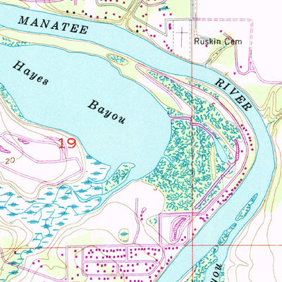A 1956 historical topographic map of Ruskin in Florida produced by the United States Geological Survey (USGS). It shows contour lines, place names, water bodies and roads. Map services and data available from U.S. Geological Survey, National Geospatial Program. Map was obtained from https://www.s...