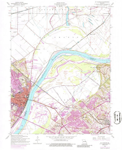 A 1954 historical topographic map of Saint Charles in Missouri produced by the United States Geological Survey (USGS). It shows contour lines, place names, water bodies and roads. Map services and data available from U.S. Geological Survey, National Geospatial Program. Map was obtained from https...