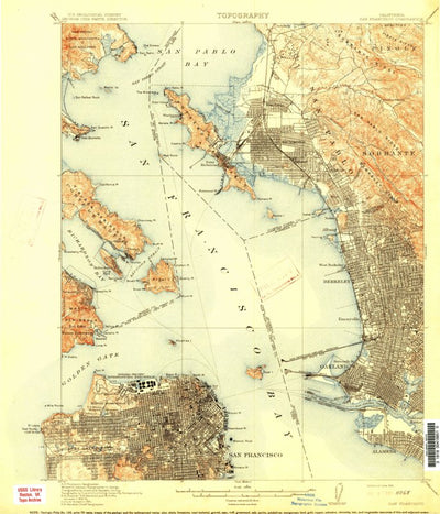 A 1915 historical topographic map of San Francisco in California produced by the United States Geological Survey (USGS). It shows contour lines, place names, water bodies and roads. Map services and data available from U.S. Geological Survey, National Geospatial Program. Map was obtained from htt...