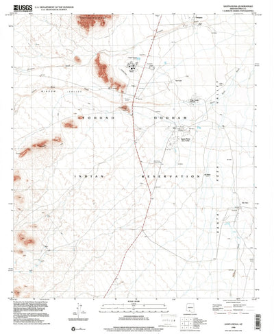 A 1996 historical topographic map of Santa Rosa in Arizona produced by the United States Geological Survey (USGS). It shows contour lines, place names, water bodies and roads. Map services and data available from U.S. Geological Survey, National Geospatial Program. Map was obtained from https://w...