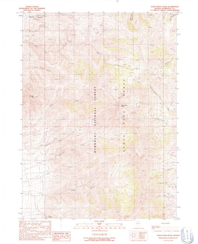 A 1991 historical topographic map of Santa Rosa Peak in Nevada produced by the United States Geological Survey (USGS). It shows contour lines, place names, water bodies and roads. Map services and data available from U.S. Geological Survey, National Geospatial Program. Map was obtained from https...